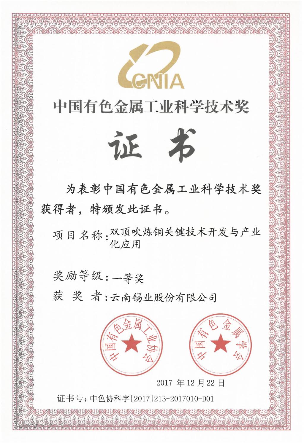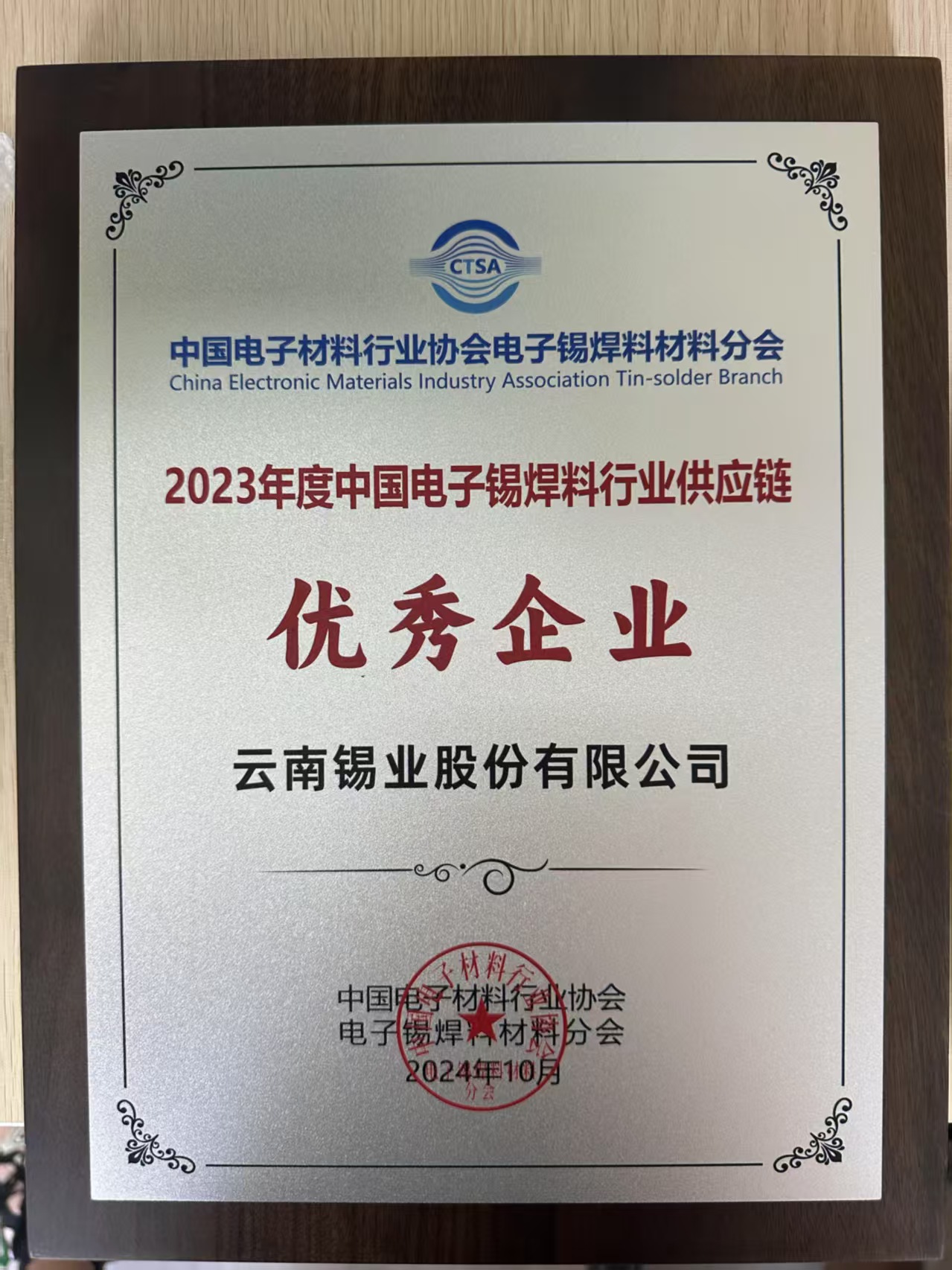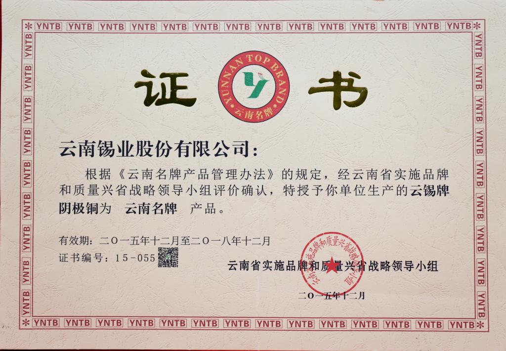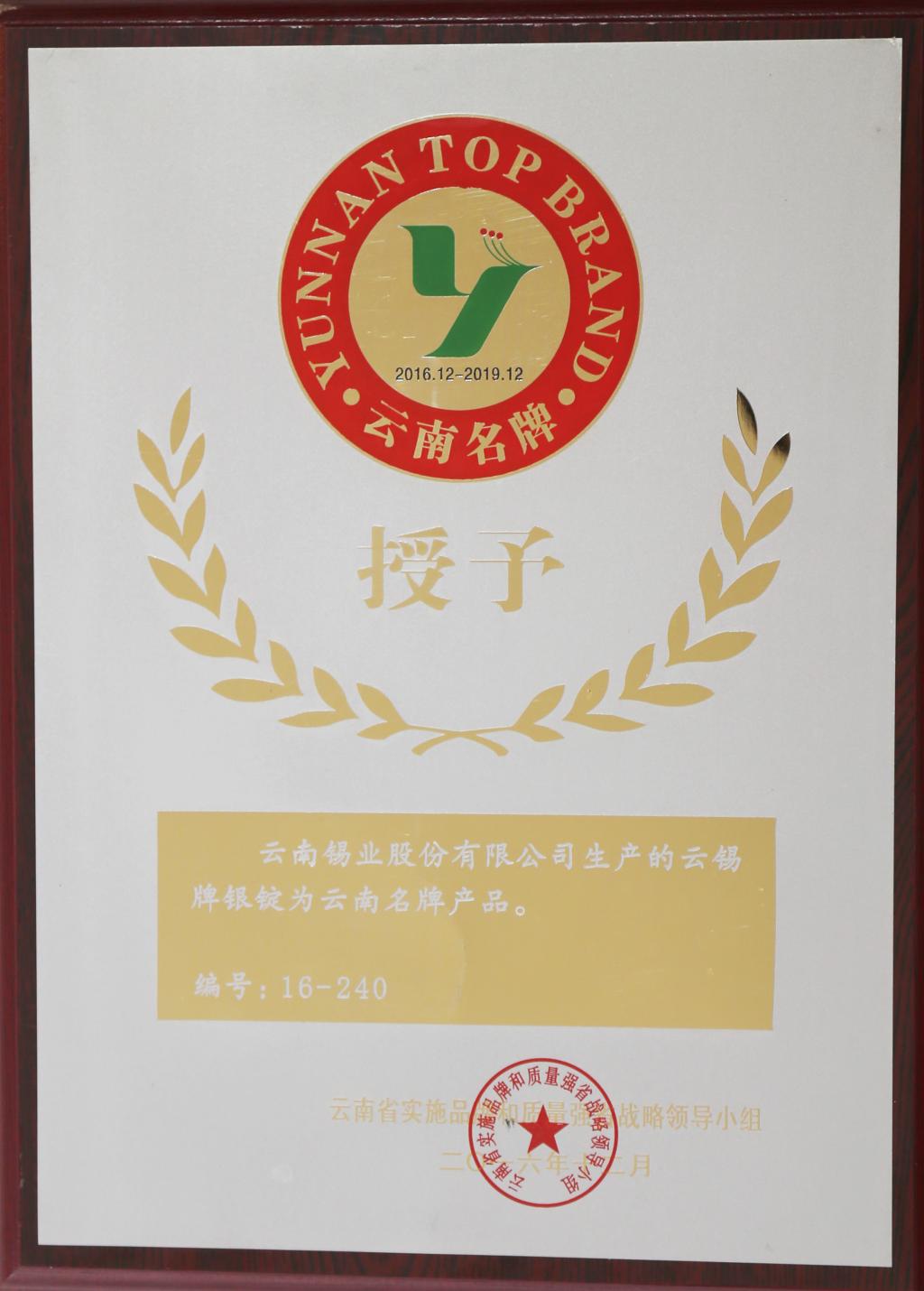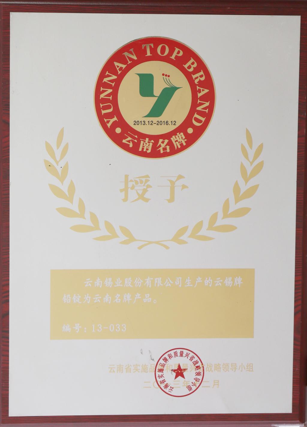 云锡牌铸造锡铅焊料获有色金属产品实物质量金杯奖证书