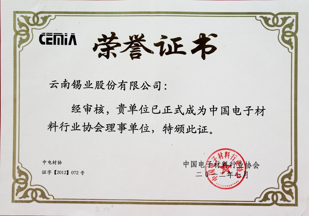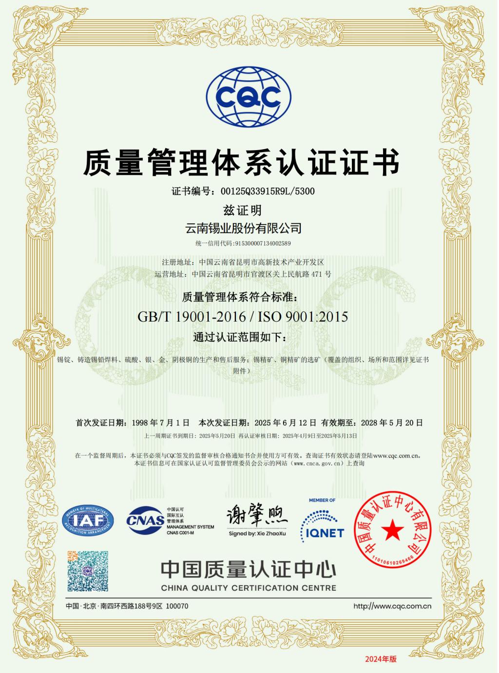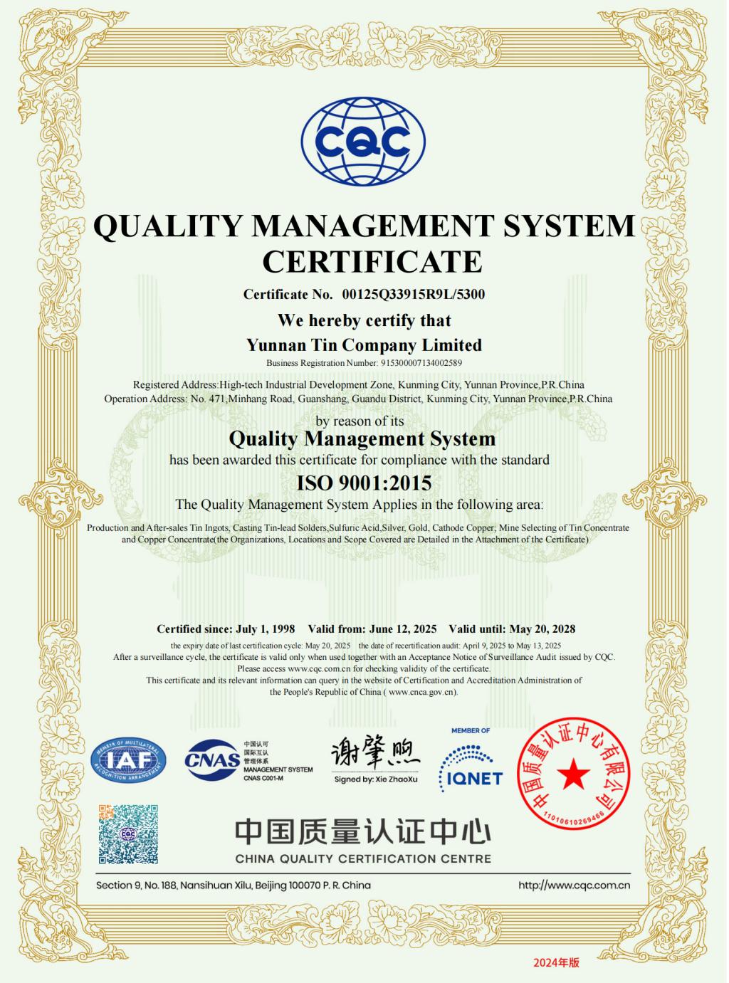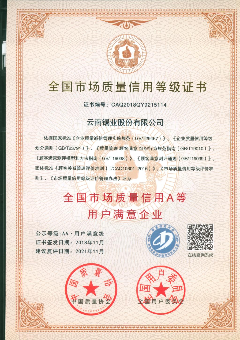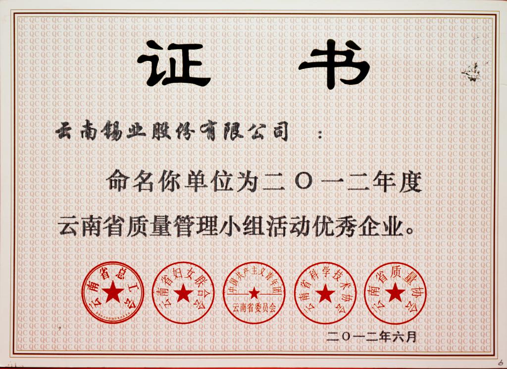 云锡牌铸造锡铅焊料获有色金属产品实物质量金杯奖证书