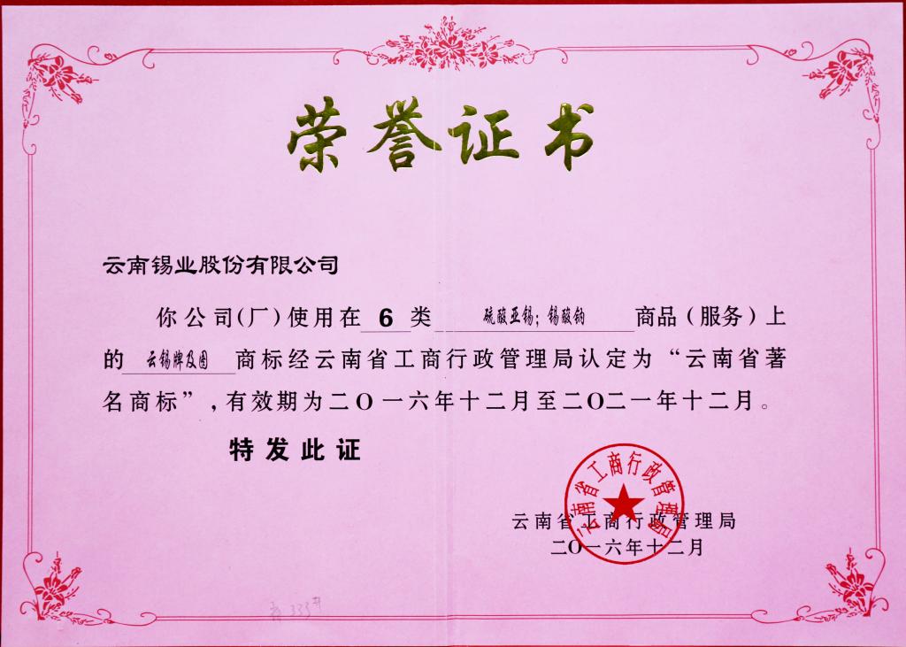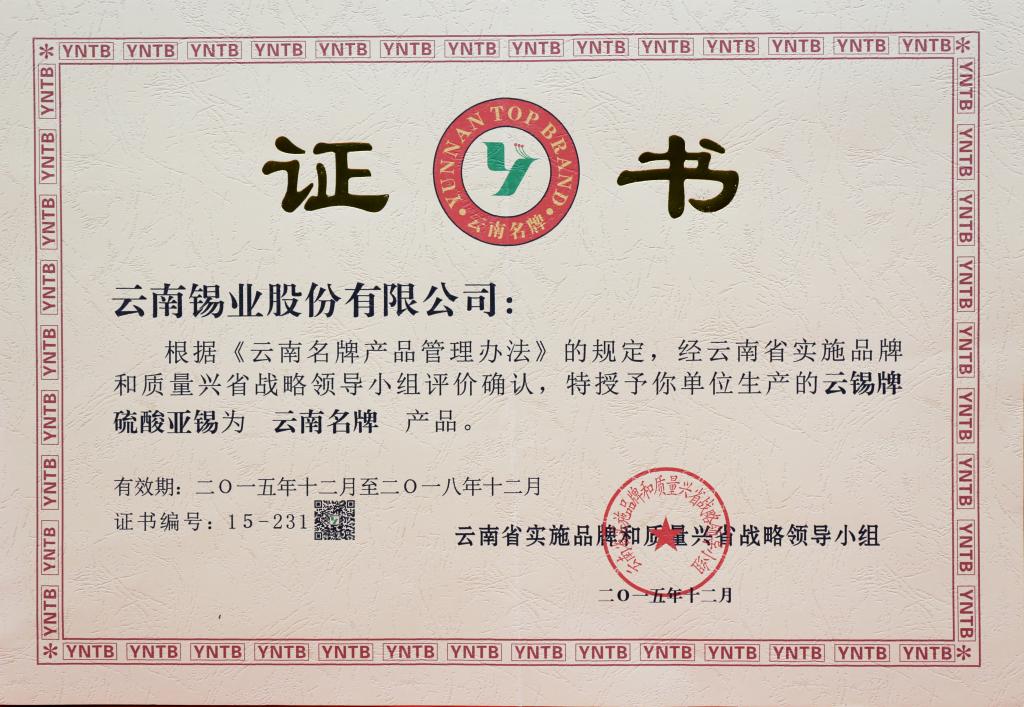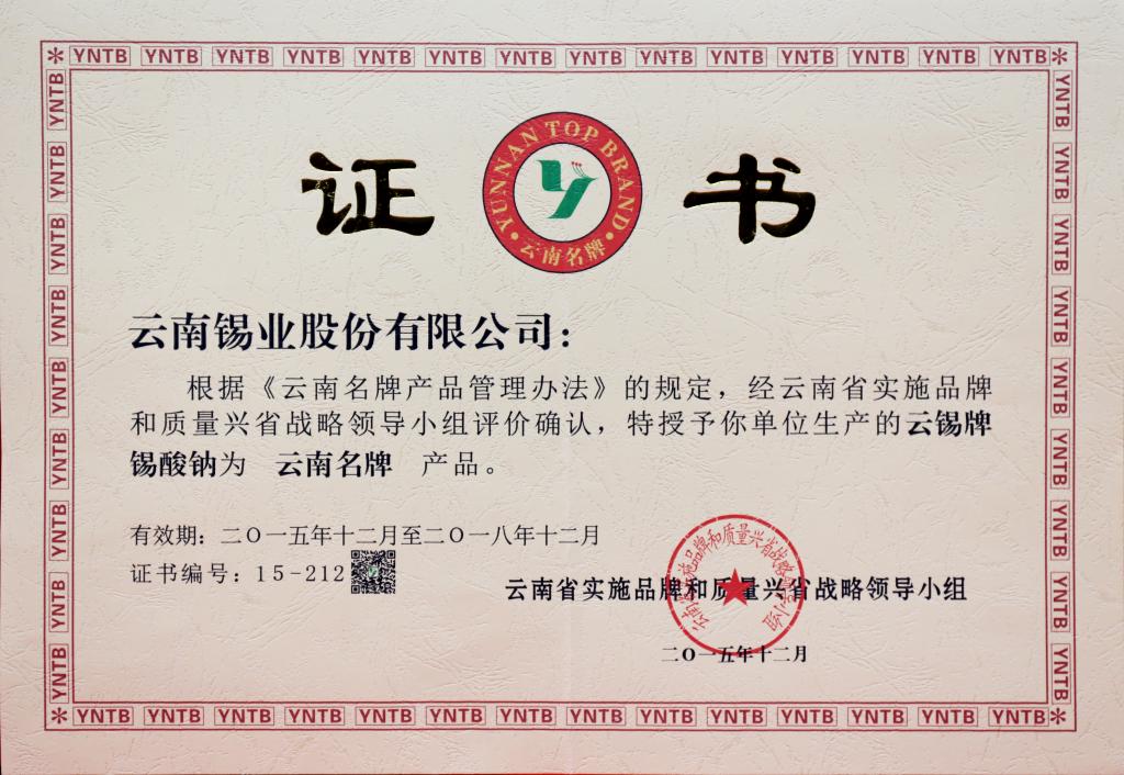 甲基硫醇锡、二丁基二氧化锡、二丁基氧化锡、偏锡酸、焦磷酸亚锡为云南省著名商标