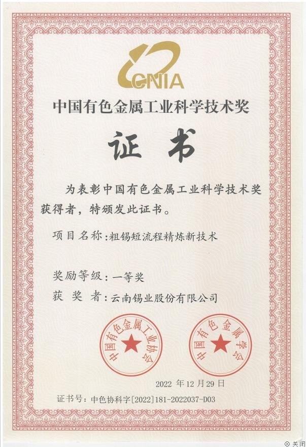 近日,中国有色金属工业协会、中国有色金属学会发布了荣获2022年度中国有色金属工业科学技术奖项目,由云锡控股公司牵头负责,伟德国际victor1946锡业分公司、昆明理工大学、绿地环保共同参与的“粗锡短流程精炼新技术项目”荣获2022年度“中国有色金属工业科学技术奖一等奖”。