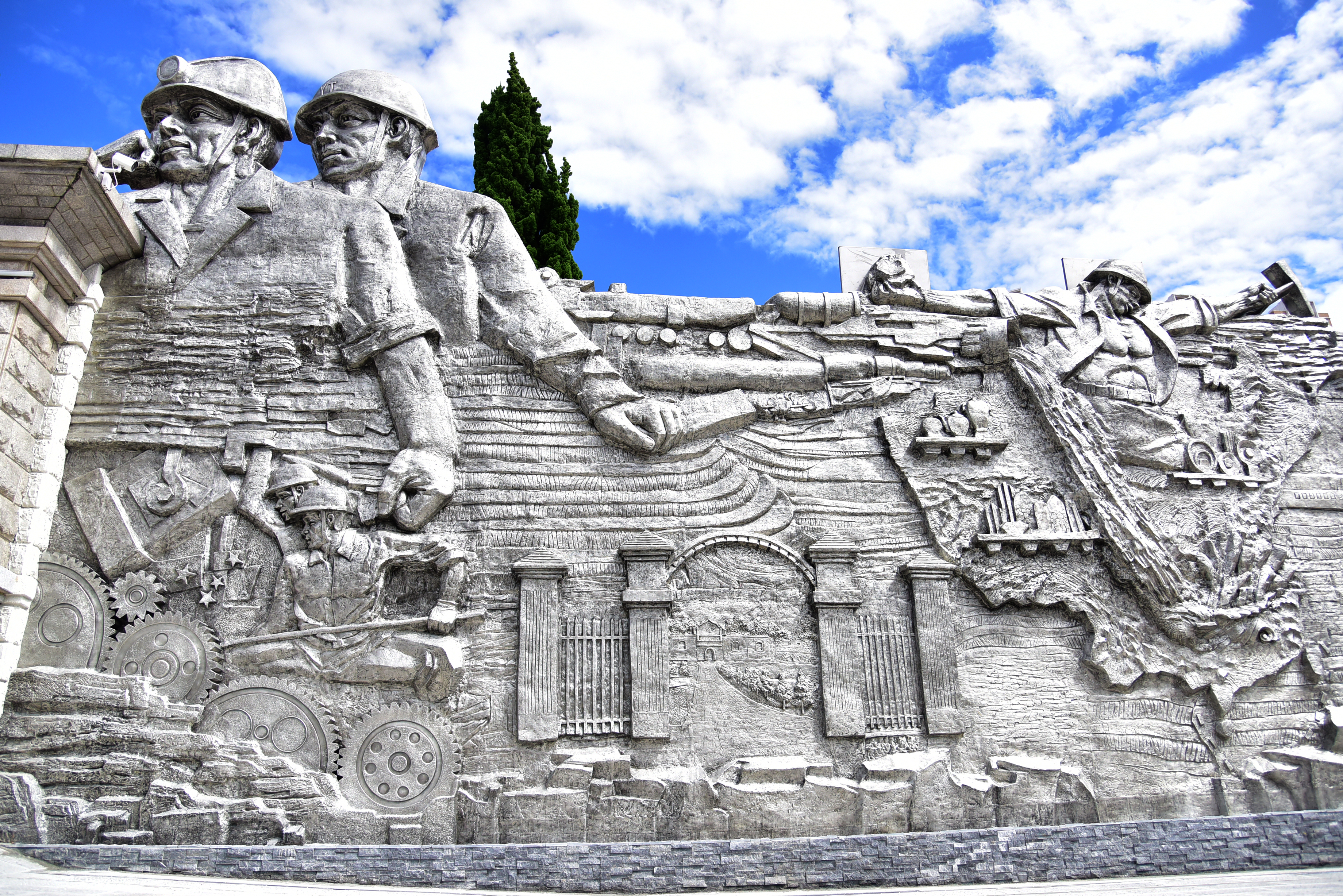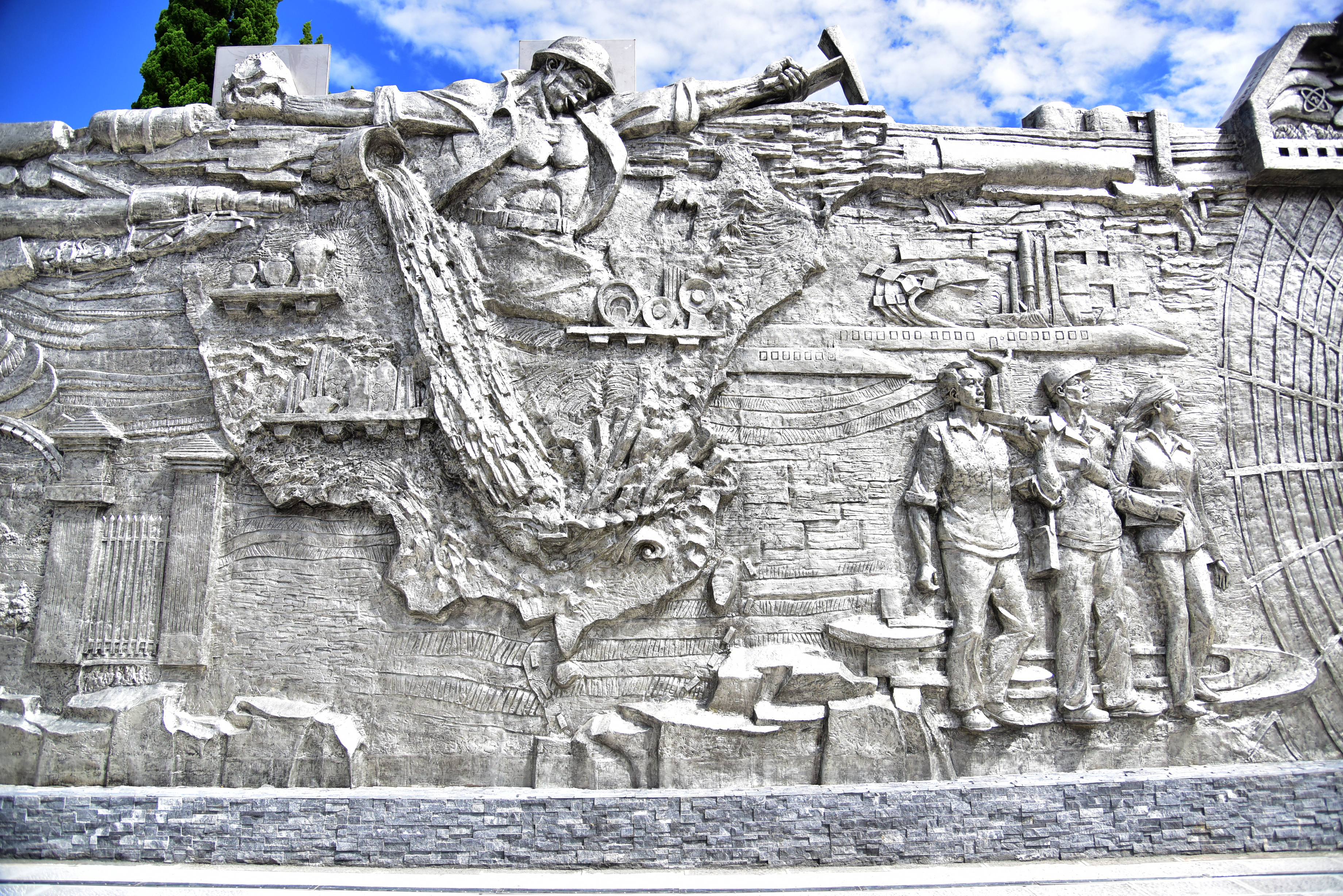 在设计方、施工方和云锡参建单位与制作人员的共同努力下,2021年10月,总长80米、平均高度5.4米的大型锡业文化主题群雕在个旧金湖东路云锡办公大楼门口落成。