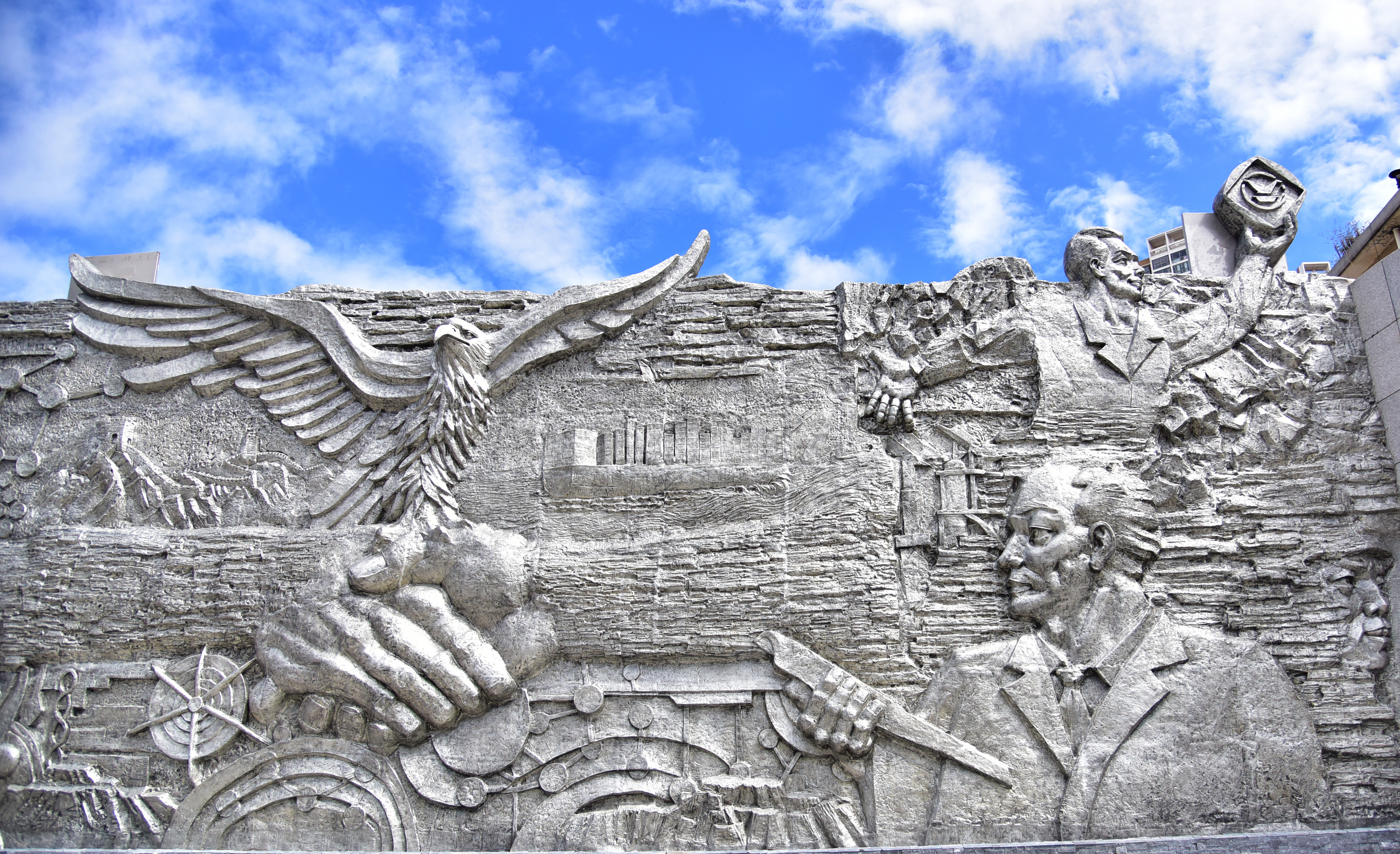 目光如炬的新时代云锡产业工人、尽显家乡民族文化的哈尼梯田、代表美誉溅满中国乃至世界的锡水、艰苦创业的古时锡业人穿越时空走进新云锡、锡产品在高铁和航天产品等行业的广泛运用、助力云锡快速发展的大型工业设备、寓意云锡技术进步的齿轮、寓意云锡全球化发展的地球、寓意引领全球锡业而展翅高飞的雄鹰、高举“YT”品牌以更宽视野注目着未来的云锡人……在以英文字母“T”为中轴的右侧主题浮雕墙上,一组组极具真实感的画面仿佛在描绘着 “云腾万里”的豪迈。