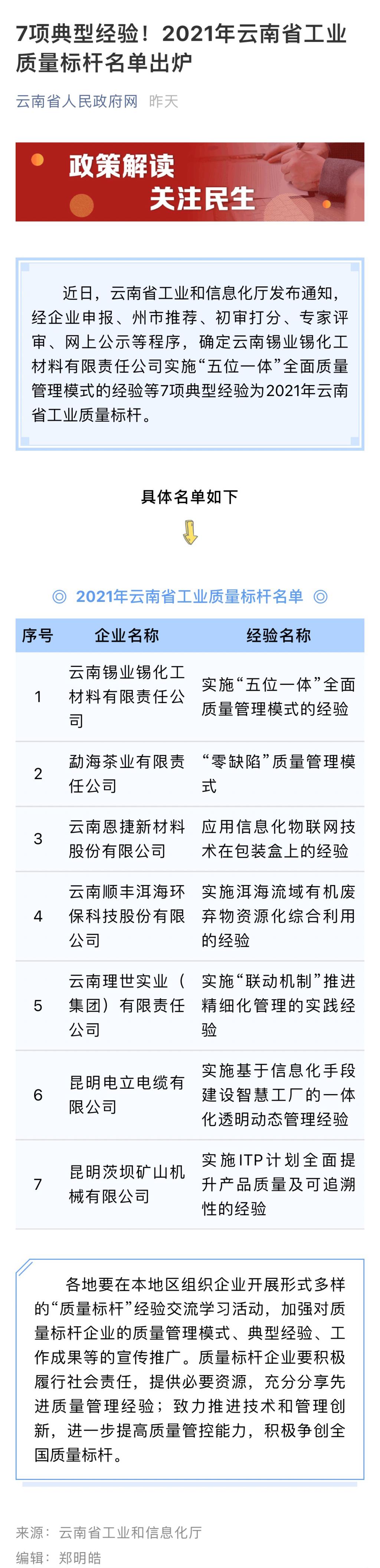 2021年云南省工业质量标杆名单出炉,锡化工上榜列首位!