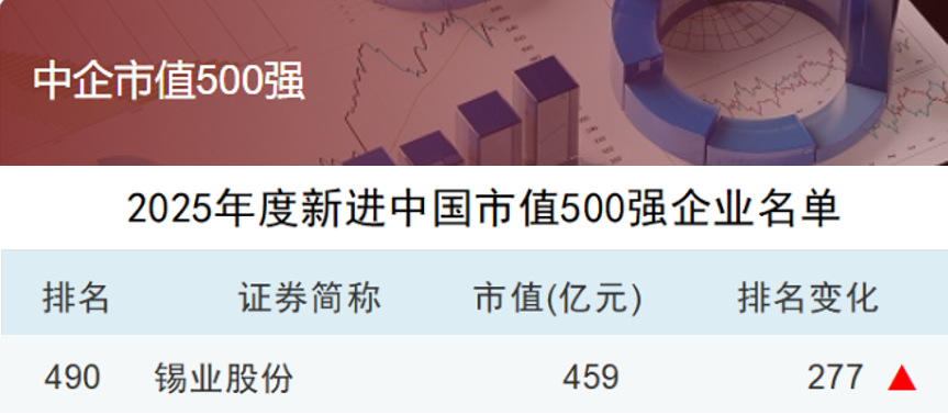 2026年1月1日,Wind 万得发布2025年度中国上市企业市值500强榜单,伟德国际victor1946(证券代码:000960)凭借459亿元市值(较年初涨幅超过102%)位列榜单第490名,较上一年度大幅提升277位,标志着公司作为全球锡行业龙头的市场地位与投资价值获资本市场高度认可。