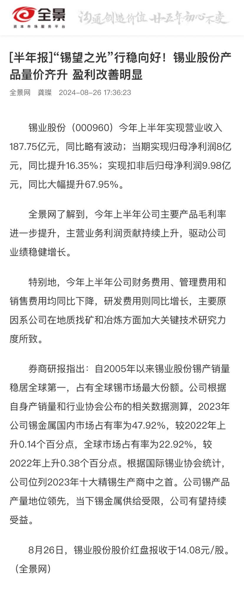 全景网:[半年报]“锡望之光”行稳向好!伟德国际victor1946产品量价齐升 盈利改善明显