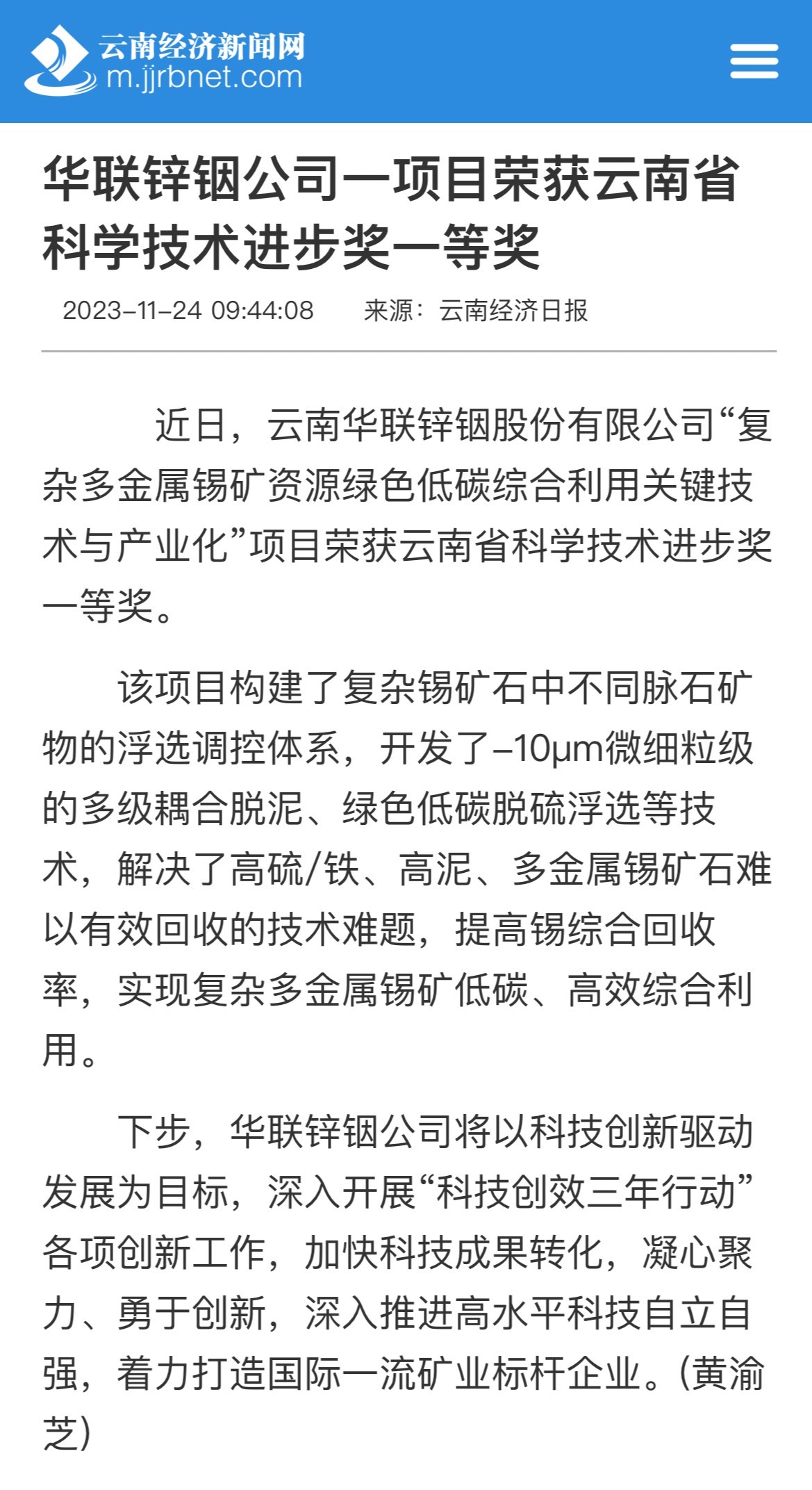 云南经济日报:华联锌铟公司一项目荣获云南省科学技术进步奖一等奖