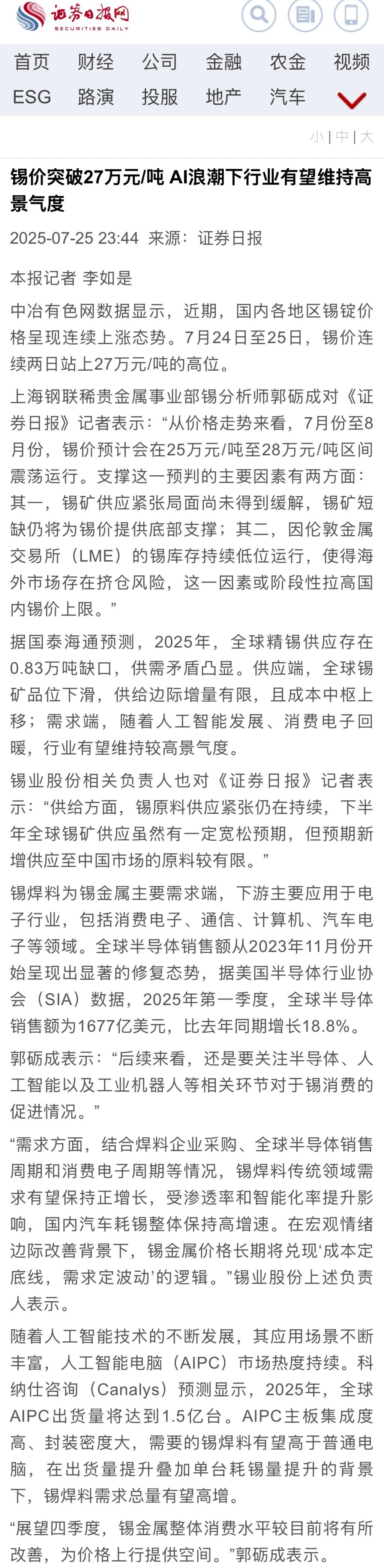 证券日报:锡价突破27万元/吨 AI浪潮下行业有望维持高景气度