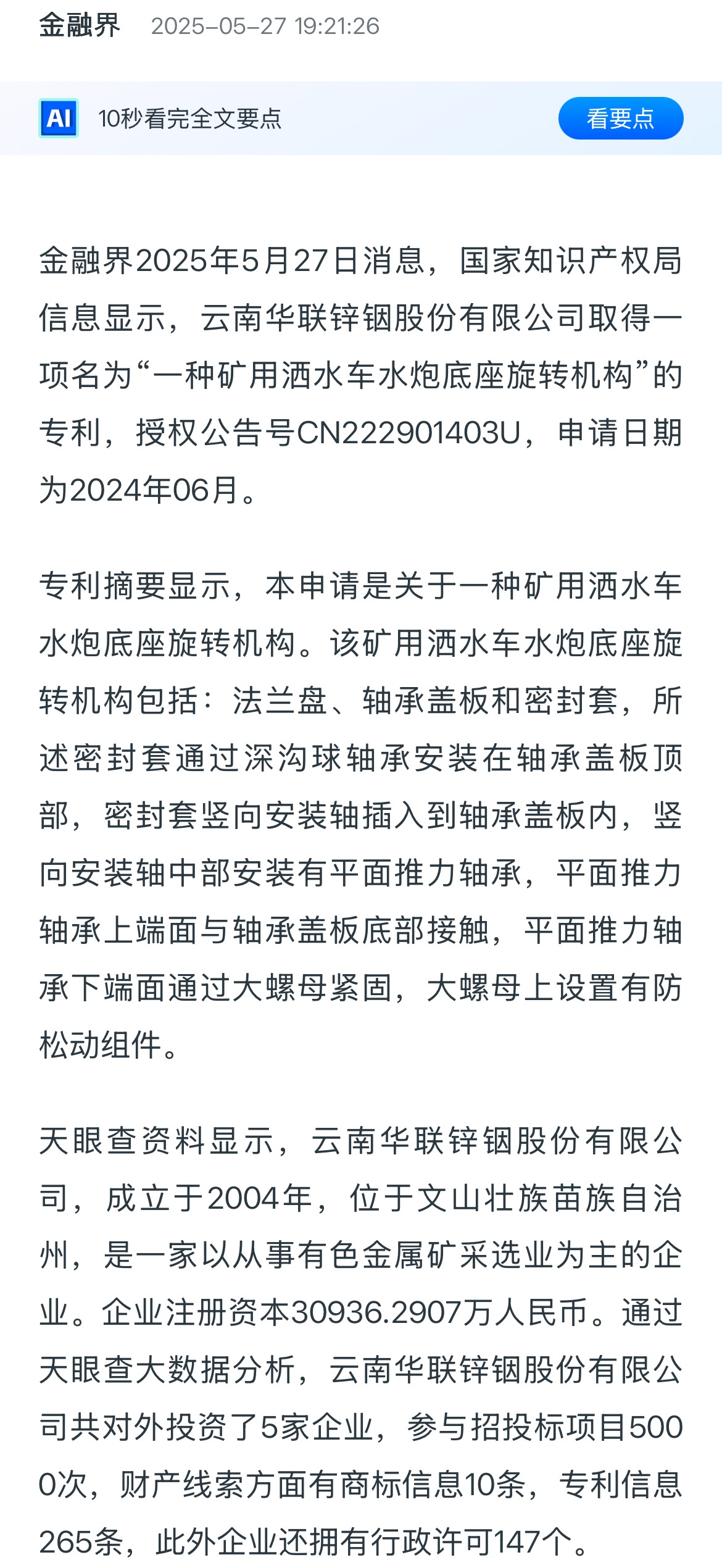 金融界:云南华联锌铟取得矿用洒水车水炮底座旋转机构专利,能够解决水炮使用寿命短的问题