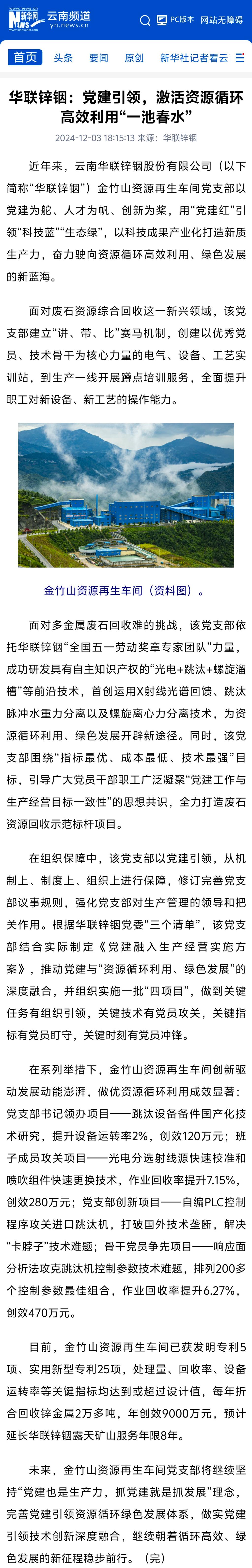 新华网:华联锌铟党建引领,激活资源循环高效利用“一池春水”