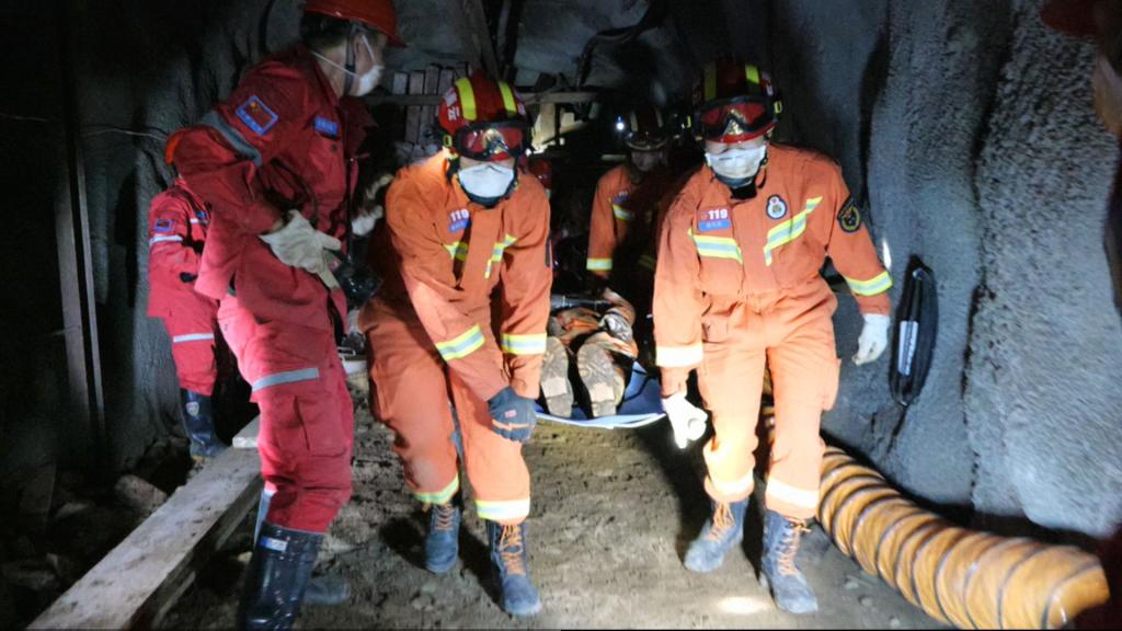 在制定科学救援方案后,救援队员佩用正压式氧气呼吸器,携带雷达生命探测仪、热成像仪、气体检测仪、对讲机和个人防护装备等进入巷道冒顶区域进行现场安全确认和被困人员搜寻,经雷达生命探测仪搜寻显示3名被困人员有生命体征,但现场一氧化碳浓度78ppm超标,需对救援现场进行机械通风,巷道冒顶严重,需进行支护。在把现场搜寻情况及时层层汇报后,救援队员携带风机、风带、支护材料和破拆工具等设备分两个组先后进入事故现场,照明、通风、巷道支护作业随即铺开。准备工作就绪后,现场救援人员采用《矿山(隧道)事故救援联络信号》联络被困人员,救援队员用细木棍将系有食品、水的导绳从管道送给受困人员,并安抚受困人员情绪。不料,在快速的支护推进中,突然地压活动频繁,顶板再次冒落,救援队在同受困人员保持联系的同时,只得暂时退至安全区域待命。4名专家技术人员再次进入事故现场勘察和评估,经专家技术组确认现场地压稳定,可以向前支护,抢险救援组再次进入现场进行向前支护、清理巷道。邹文鸿等领导在现场指挥着救援工作,要求救援人员要时刻留意事故现场环境,保证自身安全才能解救他人。经救援人员的共同努力,生命通道成功打通,被救出的3名受困人员均无大碍,已在医务人员的护送下离开事故现场,去往就近医院接受系统的检查和治疗。经救援队现场搜寻确认已无受困人员,邹文鸿下令各工作组撤离事故现场。