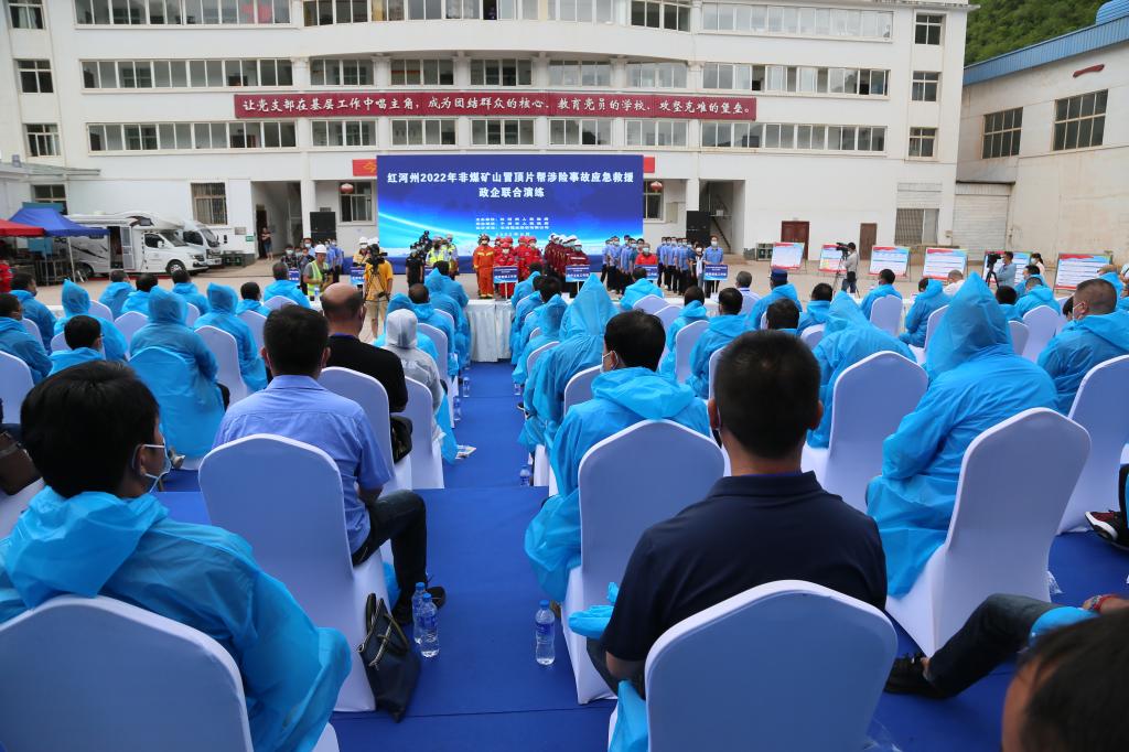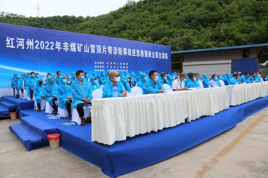 州公安局、州消防救援支队、州国土资源局、州卫计委等有关部门负责人及红河州13县市应急管理局领导和州内部分重点非煤矿山企业负责人等观摩了此次演练。