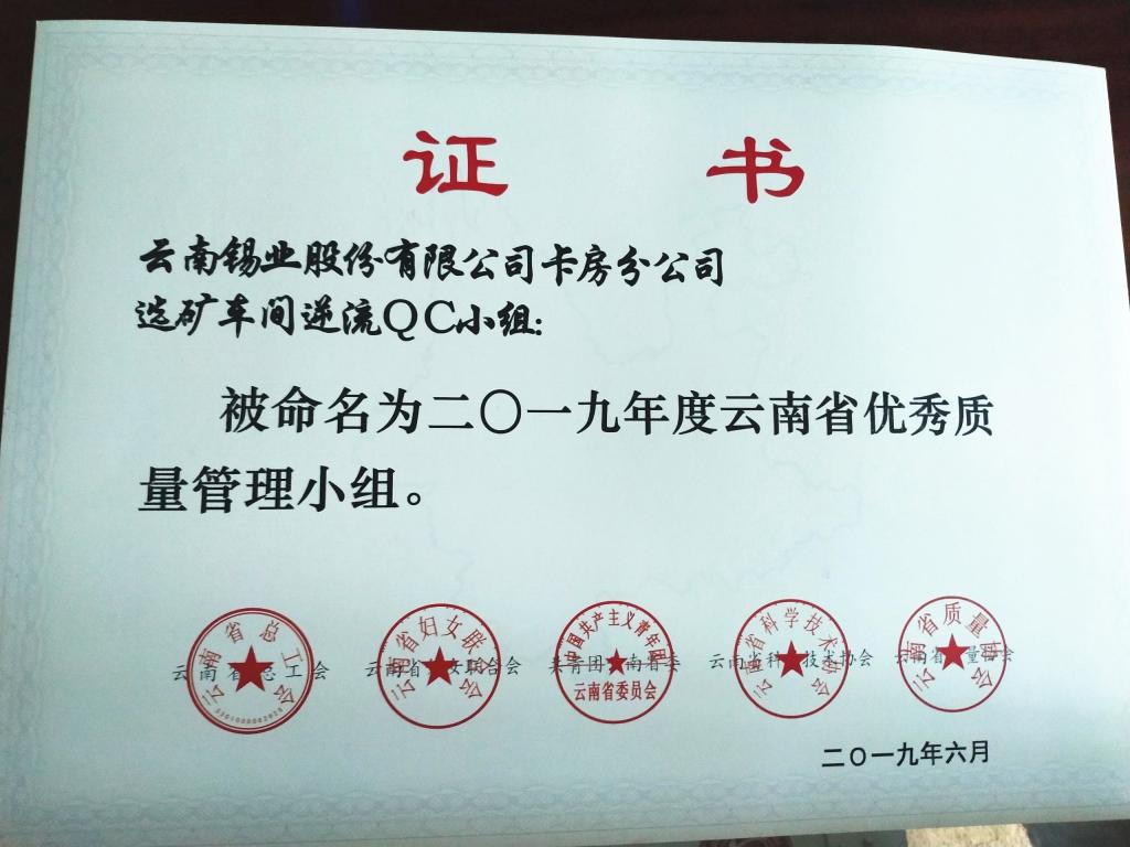 6月27日,在云南省质量协会QC成果发布会上,卡房分公司选矿车间逆流QC小组荣获2019年度云南省优秀质量管理小组荣誉称号。