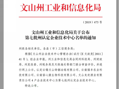 近日,云锡文山锌铟冶炼有限公司同云南强丰农业科技有限公司、云南苗心康生物科技有限公司、文山龙欢酒业有限责任公司4家企业获第七批州认定企业技术中心荣誉称号。