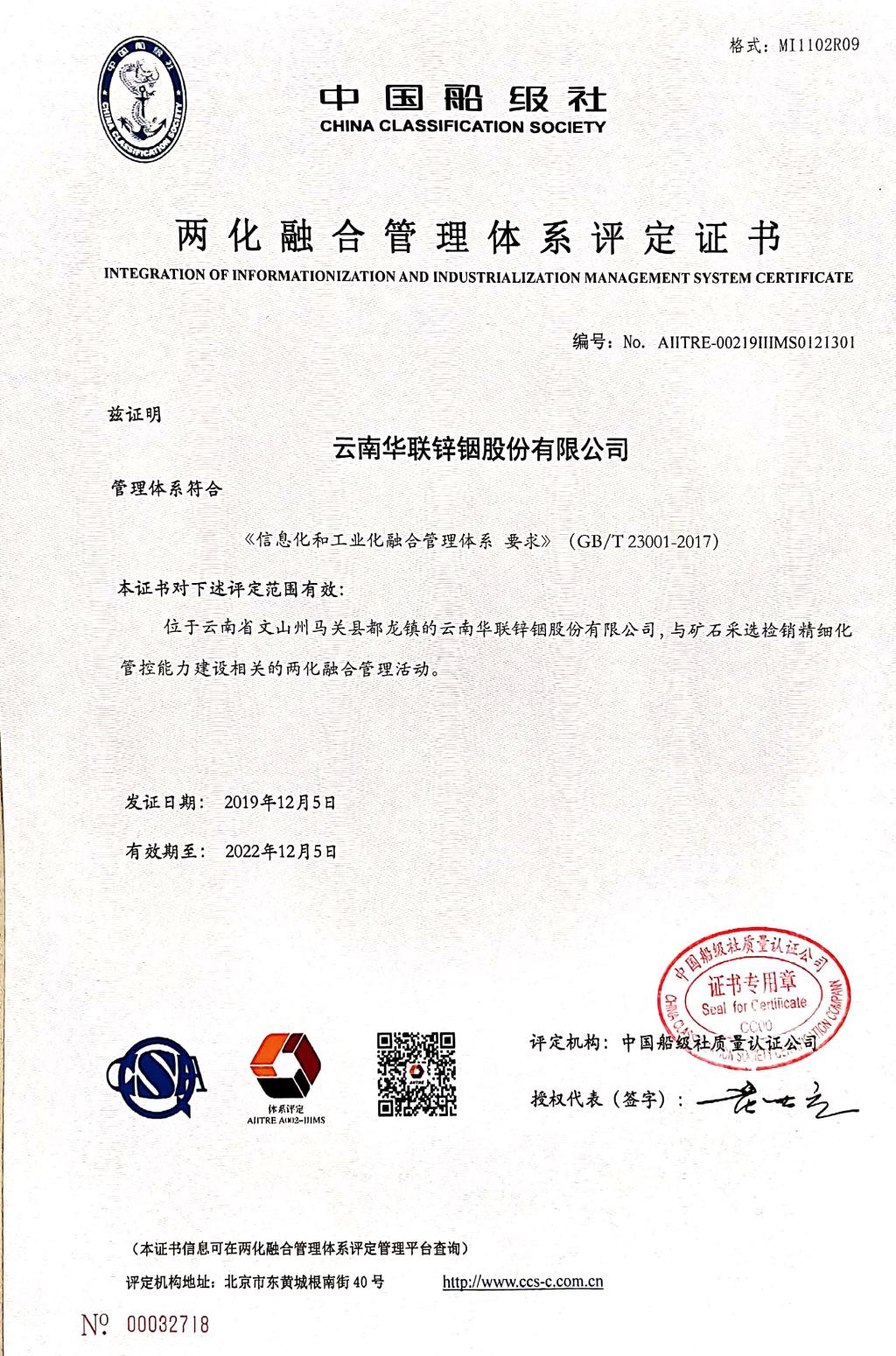 12月5日,华联锌铟公司通过交通部直管事业单位中国船级社两化融合管理体系认证,并颁发“两化融合管理体系认证证书”,成为文山州第一家通过该项体系认证的成员企业。