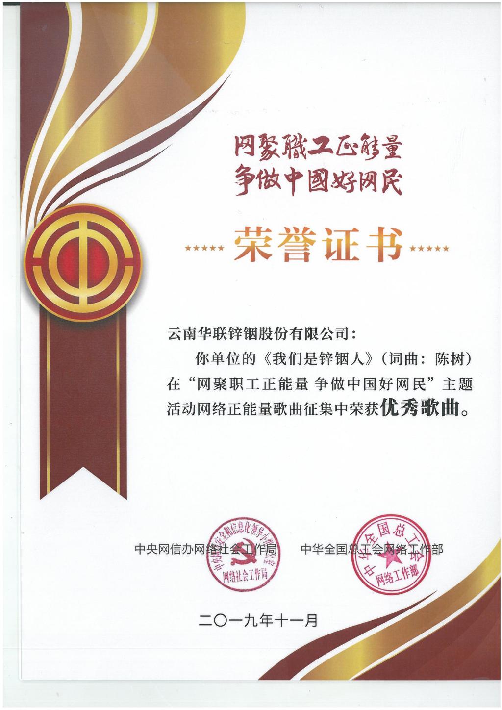 公司形象歌曲《我们是锌铟人》MV在全国“网聚职工正能量 争做中国好网民”主题活动中荣获殊荣