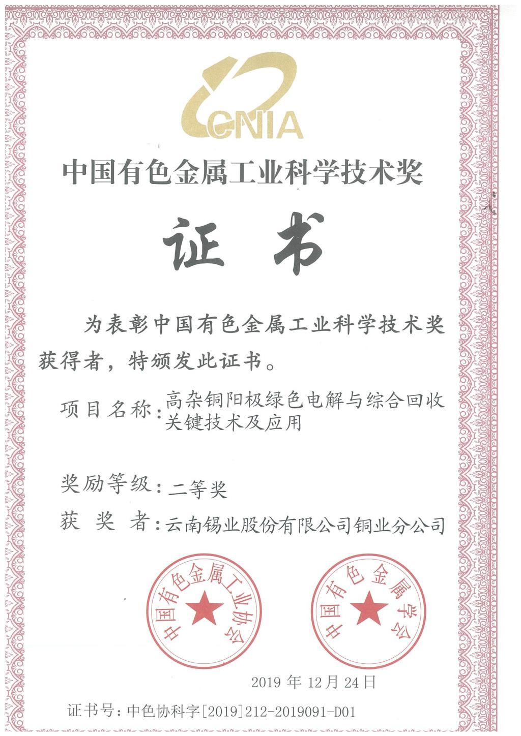 近日,铜业分公司收到中国有色金属工业协会颁发的荣誉证书,铜业分公司申报的《高杂铜阳极绿色电解与综合回收关键技术及应用》荣获中国有色金属工业科技进步二等奖。
