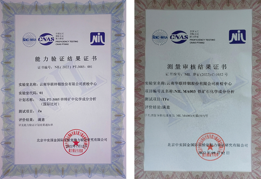 华联锌铟公司质检中心于2022年5月参加北京中实国金实验室能力验证研究有限公司申报的国家级实验室认可领域检测项目,并顺利通过锌精矿、铁矿石化学成分分析国际检测认可。