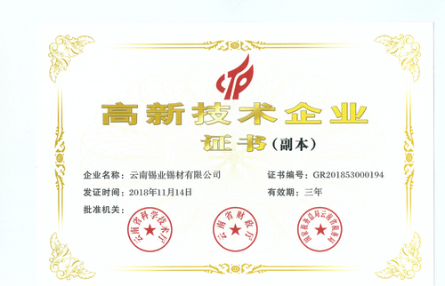 锡材公司连续四次通过高新技术企业认定